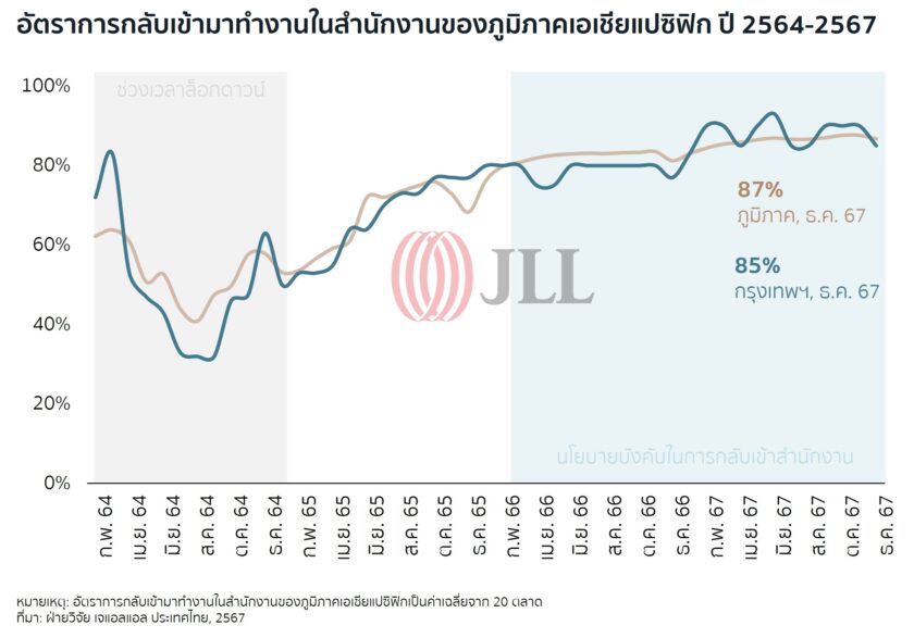 ไมเคิล แกลนซี่ กรรมการผู้จัดการ เจแอลแอล ประจำประเทศไทย อินโดนีเซีย ฟิลิปปินส์ และ เวียดนาม กล่าวว่าในขณะที่บริษัทต่าง ๆ ทบทวนกลยุทธ์เชิงพื้นที่และสภาพแวดล้อมในการทำงาน เทรนด์การกลับมาทำงานที่สำนักงานกำลังได้รับความนิยมเพิ่มขึ้น ส่งผลให้ความต้องการพื้นที่สำนักงานคุณภาพสูงในย่านศูนย์กลางธุรกิจของกรุงเทพฯ (CBA) เพิ่มขึ้น โดยหลายองค์กรกำหนดให้พนักงานกลับเข้ามาทำงานที่อาคารสำนักงานมากขึ้น ทำให้เกิดการขยายและปรับปรุงพื้นที่ เพื่อดึงดูดและรักษาบุคลากรคุณภาพสูง