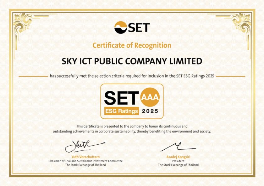 การได้รับเรทติ้ง “AAA” ซึ่งเป็นระดับสูงสุดของ SET ESG Ratings ในปี 2568 ถือเป็นเครื่องยืนยันว่า SKY ICT ไม่เพียงเติบโตจากผลประกอบการและศักยภาพทางธุรกิจเท่านั้น แต่ยังสามารถผสาน กลยุทธ์เทคโนโลยี เข้ากับ ความรับผิดชอบต่อสังคม สิ่งแวดล้อม และธรรมาภิบาล ได้อย่างสมดุลในทุกมิติขององค์กร