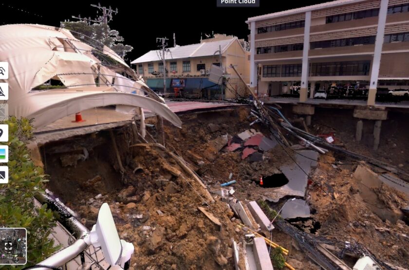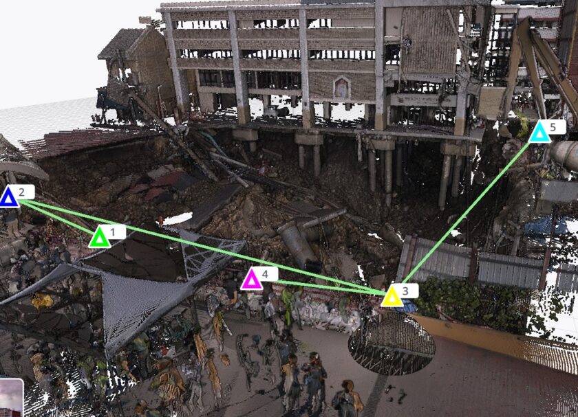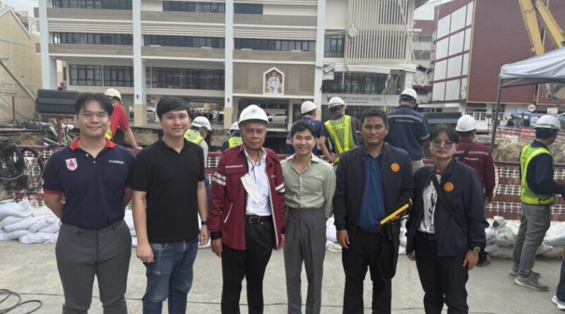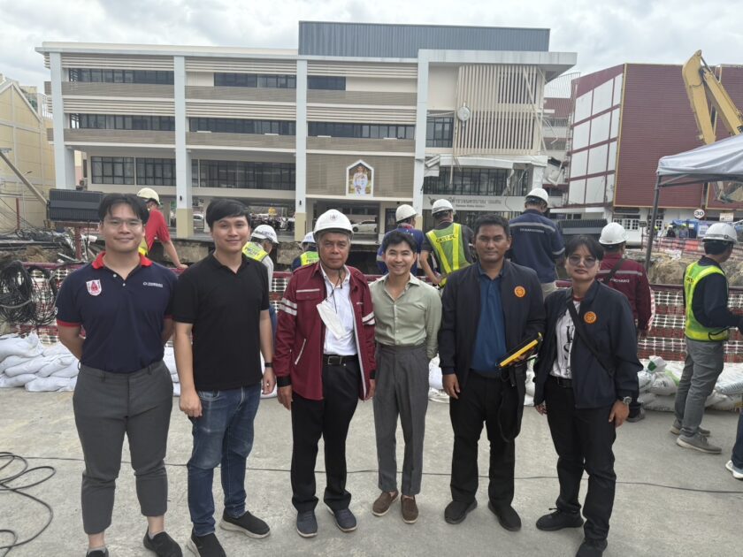 รศ. ดร.พรหมพัฒน ธัญสิริชัยศรี นักวิจัยจากศูนย์วิจัย IIMRaS คณะวิศวกรรมศาสตร์ ร่วมกับ ผศ. ดร.อมรเทพ จิรศักดิ์จำรูญศรี สาขาวิชาเทคโนโลยีเพื่อการพัฒนายั่งยืน คณะวิทยาศาสตร์และเทคโนโลยี มหาวิทยาลัยธรรมศาสตร์ ลงพื้นที่ตรวจสอบบริเวณที่เกิดเหตุ พร้อมด้วยผศ.ดร.ธเนศ วีระศิริ ที่ปรึกษาวิศวกรรมสถานแห่งประเทศไทย ในพระบรมราชูปถัมภ์ (วสท.) โดยนำเทคโนโลยี สแกนสามมิติ (3D Scan) มารวบรวมข้อมูลสภาพพื้นผิวและภูมิประเทศอย่างละเอียด พร้อมผสานกับการประมวลผลด้วย AI InSpectra ซึ่งเป็นระบบวิเคราะห์เชิงวิศวกรรมโครงสร้าง เพื่อสร้างฐานข้อมูลสามมิติที่ครบถ้วนและแม่นยำสำหรับการวิเคราะห์เชิงลึกอย่างเร่งด่วน
